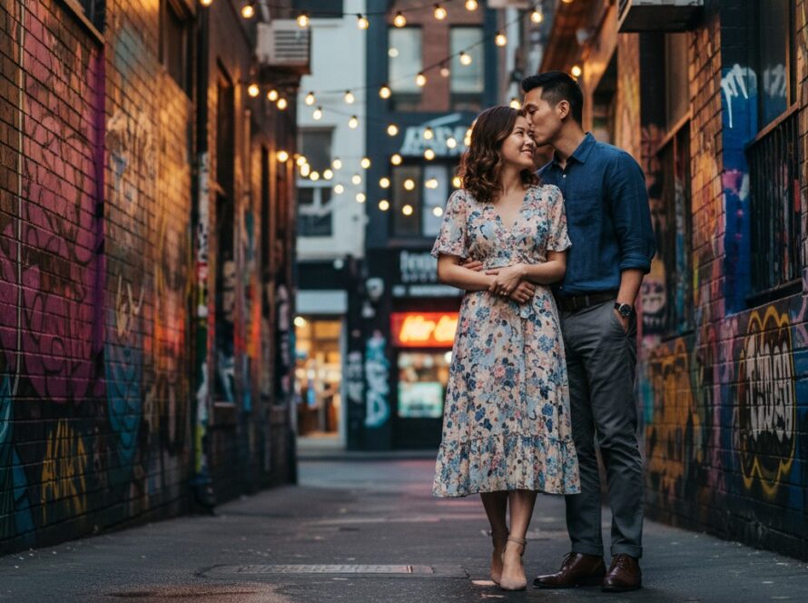 Dive into the heart of Melbourne’s artistic spirit with a shoot amidst its famous laneways. Hosier Lane, with its ever-changing canvas of vibrant street art, offers an edgy, colourful backdrop. Nearby, AC/DC Lane provides a rock ‘n’ roll vibe, perfect for couples wanting something a bit more unconventional and bold. These locations are fantastic for capturing candid, energetic street photo moments.